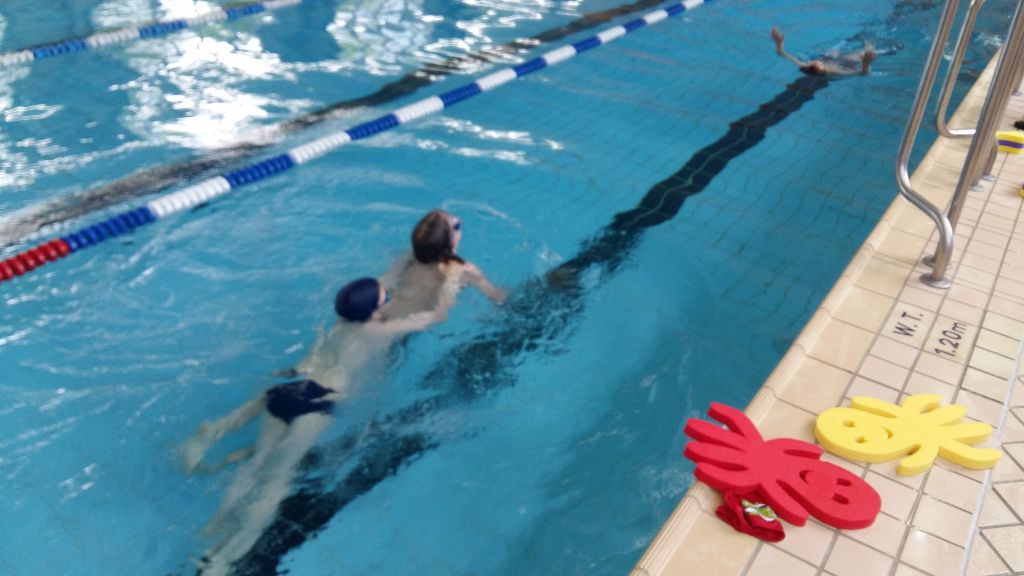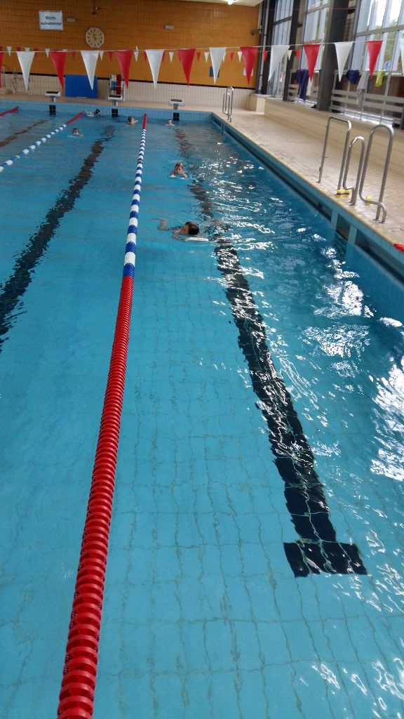 Der erste Tag der Projektwoche unter dem Motto Sport startete früh um 8.00 Uhr. Trotz des großen Unwetters in der Nacht waren alle Schüler wach und top motiviert. Die Runde bestand aus 7 Schülern zwischen 9 und 11 Jahren, zwei Lehrern, dem Kinderkoordinator des Triathlon Jena e.V., Daniel Reinhardt-Felbel und der Bfd’lerin und Betreuerin für diese Woche, Jasmin Nachtwey. Zu Beginn gab es einige Informationen zum Triathlon Jena e.V. an sich und der Nachwuchsarbeit allgemein. Um den Kinder zu zeigen, dass der Triathlon auch stark mit der Stadt Jena verbunden ist, zeigten wir den Kindern eine Dokumentation über Steffen Justus, einem Jenaer Profitriathleten und seinem Weg zu Olympia 2012. Weiter ging es mit einem Überblick über die geplanten Programmpunkte der Woche und einer kleinen Kennlernrunde durch die Schüler. Bevor es dann ins Wasser ging, konnten sich die Kinder bei einem Frühstück nochmal kräftig stärken. Um 09:45 Uhr traten wir dann den Weg zur Schwimmhalle Lobeda-West an. Dort hatten wir dann eine Schwimmzeit von 1,5 h, in der sich die Schüler ordentlich austoben konnten. Zu Beginn eines Schwimmtrainings erfolgt immer eine Erwärmung im Trockenen und so starteten auch wir mit Arm-, Schulter-, Hüftkreisen und „Hampelmännern“. Danach erfolgte ein Einschwimmen mit 4 Bahnen Brust und Rückenschwimmen. Da am Anfang noch alle voller Energie waren, erledigten wir gleich die erste Disziplin für das Deutsche Sportabzeichen, welches alle am Ende der Woche als Highlight erhalten sollen. Die 25 m-Sprint-Prüfung absolvierten alle Schüler in einer guten Zeit und haben so schon mal einen guten Grundstein gelegt. Weiter ging es mit Staffelspielen, für die wir 2 Teams bildeten. Zuerst ging es darum, Lasten wie Bretter und Tauchringe, so schnell wie möglich von der einen zur anderen Seite zu bringen. Das nächste Spiel nannte sich „Aufräumen“. Hierbei warf Team 1 alle vorhanden Gegenstände ins Wasser und Team 2 musste diese dann auf Zeit wieder alle an Land bringen, danach wurde getauscht. Weiter ging es mit Wettschwimmen – Alle gegen Alle. Zum einen musste 25m Rücken geschwommen werden, mit einer Rolle in der Hälfte der Bahn und dann noch einmal 25m Brust mit tauchen und hochholen von Tauchringen. Sowohl bei den Staffelspielen als auch bei dem Wettschwimmen gingen alle Schüler mit viel Ehrgeiz an die Sache, aber der Spaß kam dabei auch nicht zu kurz. Weiter ging es mit Beinarbeit. Dabei übten die Kinder mit Hilfe eines Schwimmbrettes den Beinschlag in Brust, aber auch in Kraul, welches einigen doch noch schwer fiel. Auch das Transportschwimmen wie bei den Rettungsschwimmern konnten die Schüler noch erlernen. Dabei zog der eine seinen Partner hinter sich her, in dem sich dieser an den Schultern festhielt. Zum Schluss hatten wir dann noch Zeit eine Runde Wasserball zu spielen oder einfach so im Wasser herum zu tollen. Somit ging der erste Tag sehr schnell vorbei. Alle Schüler haben gut mitgemacht und haben auch gezeigt, dass sie untereinander sehr gut miteinander agieren können. Es war ein guter Start in die Woche und so, wie ich die Gruppe kennengelernt habe, dürfte es auch so gut weitergehen.