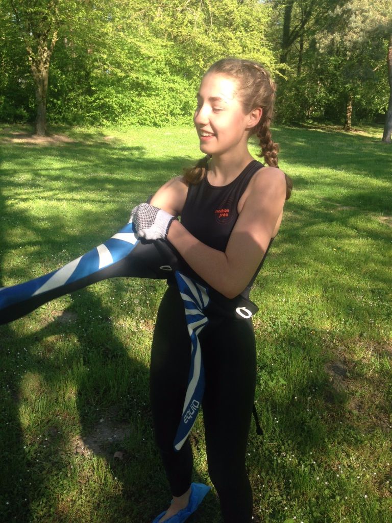 Rebecca hatte sich am Rand des Feldes platziert, um dem Gedränge der 50 Starterinnen etwas aus dem Weg zu gehen. So musste sie den etwas weiteren Weg schwimmen, konnte sich aber am Ende des Mittelfeldes platzieren. Beim Wechsel machte sich leider die fehlende Übung beim Ausziehen des Neos bemerkbar und so konnten noch einige Konkurrentinnen an ihr vorbeiziehen. In einer kleinen Radgruppe kämpfte sie um Anschluss an die Große Gruppe, in der die zweite Thüringerin Helene Gessner vertreten war. Der Anschluss gelang leider nicht mehr und so musste das Laufen am Ende für eine bessere Platzierung sorgen. Zwei Runden a 1,25km waren zu absolvieren. Ein schneller Wechsel vom Rad in die Laufschuhe und ein beherzter Lauf sorgten noch für einige Positionsverbesserungen. Am Ende stand bei Beccs ein 39. Rang zu Buche.