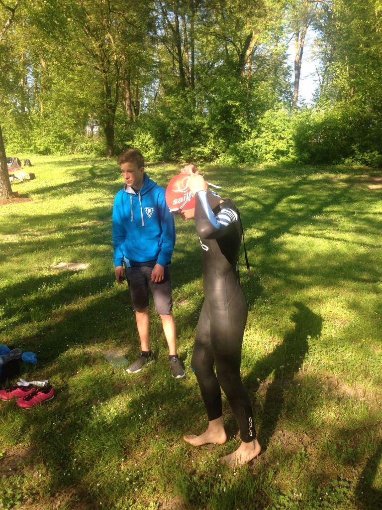 Theo stürzte sich einige Minuten nach Rebecca in den sehr kalten See. Alle hatten noch 2 Tage zuvor fest mit einem Duathlon gerechnet, der Theo mit seiner Laufstärke sicherlich zu Gute gekommen wäre. Aber die Temperatur des Sees stieg von Tag zu Tag und irgendwie innerhalb einer Woche von 12 auf 17 Grad. Ausreichend für einen Triathlon. Auch Theo ist das Neoschwimmen nicht gewöhnt und musste in der ersten Disziplin Lehrgeld zahlen. Als 51. Von 58. Startern entstieg er dem See. Wer den „Sonnebergschen“ Kampfgeist kennt weiß, dass er sich damit aber nicht geschlagen gab. Ohne wirkliche Radgruppe schob er sich trotzdem Stück für Stück nach vorn und sammelte einige Sportler ein. Beim Lauf zeigte er dann, was seine Paradedisziplin ist. Auch wenn 2,5km natürlich kurz sind, so konnte er fast die gesamte 3. Radgruppe noch einholen und so am Ende auf Platz 42. vorlaufen.