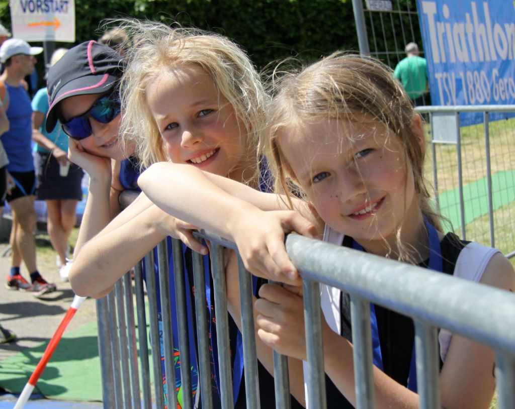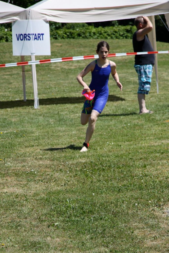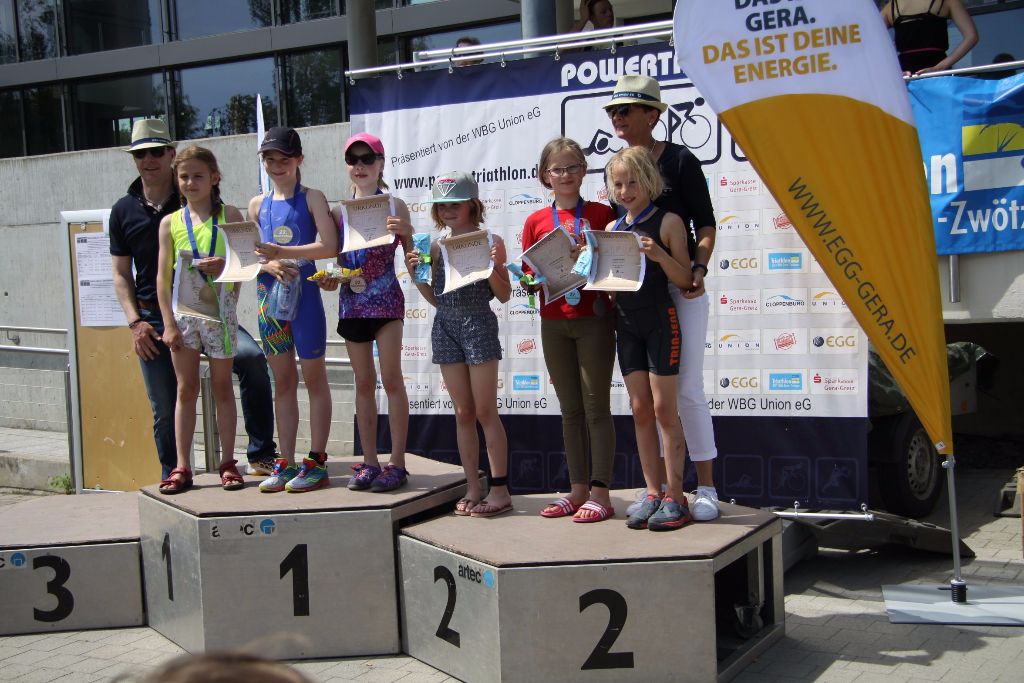Die jüngsten Jenaer Athleten starteten mit 100m Schwimmen, 2,5km Rad fahren und abschließenden 400m laufen. Jan Hammerl zeigte einen guten Schwimmauftakt, ihm folgte mit Pepe Alles ein weiterer Jenaer. Beide erreichten am Ende einen guten Platz im vorderen Mittelfeld, für beide war es ein großes Abenteuer. Bei den Mädchen waren gleich 6 Jenaerinnen im 30-köpfigen Starterfeld. Und gleich von Anfang bewiesen Anna Burtscher, Linnéa Fröber und Judith Hüter mit hervorragenden Schwimmzeiten, dass an ihnen heute kein Vorbeikommen möglich ist. Anna setzte mit 2:00min/100m den Grundstein, Linnéa mit 2:18min/100m und Judith mit 2:30min/100m folgten auf die Radstrecke. Ebenso noch in Schlagweite Jolanda Obst. Im Ziel hatte Anna als Siegerin 12 sec Vorsprung vor Linnéa, die wiederum 12sec Vorsprung auf die drittplatzierte Charlotte Nicolea hatte. Judith finishte ebenso noch in weniger als 10 Minuten und wurde mit Rang 6 belohnt. Jolanda Obst landete auf Rang 8 und wurde somit die vierte Jenaer Sportlerin unter den TOP 8.