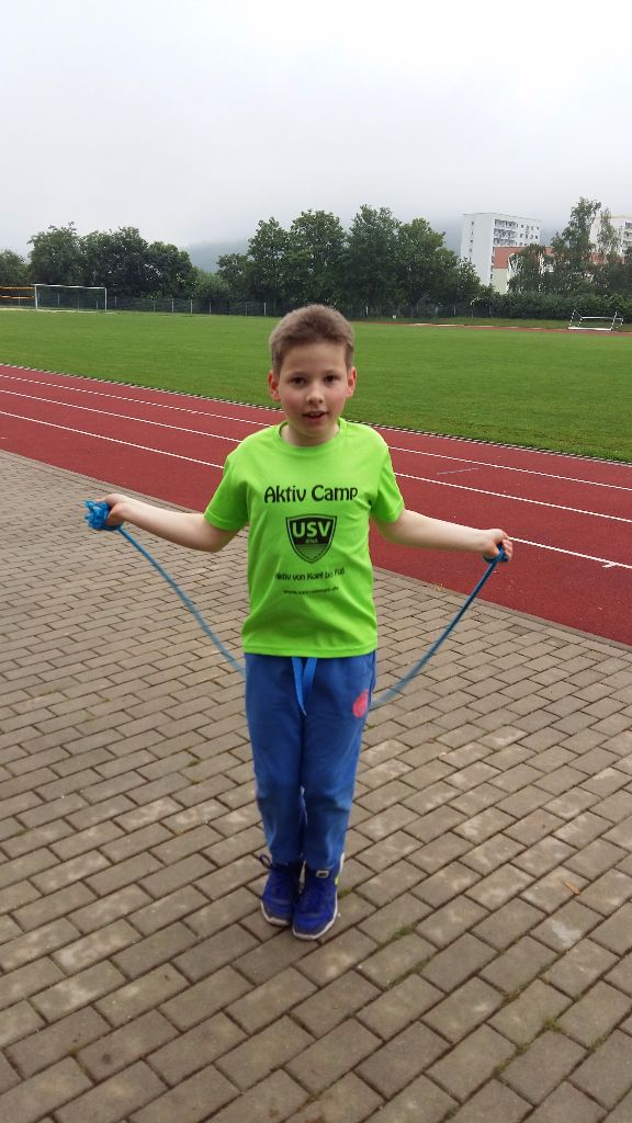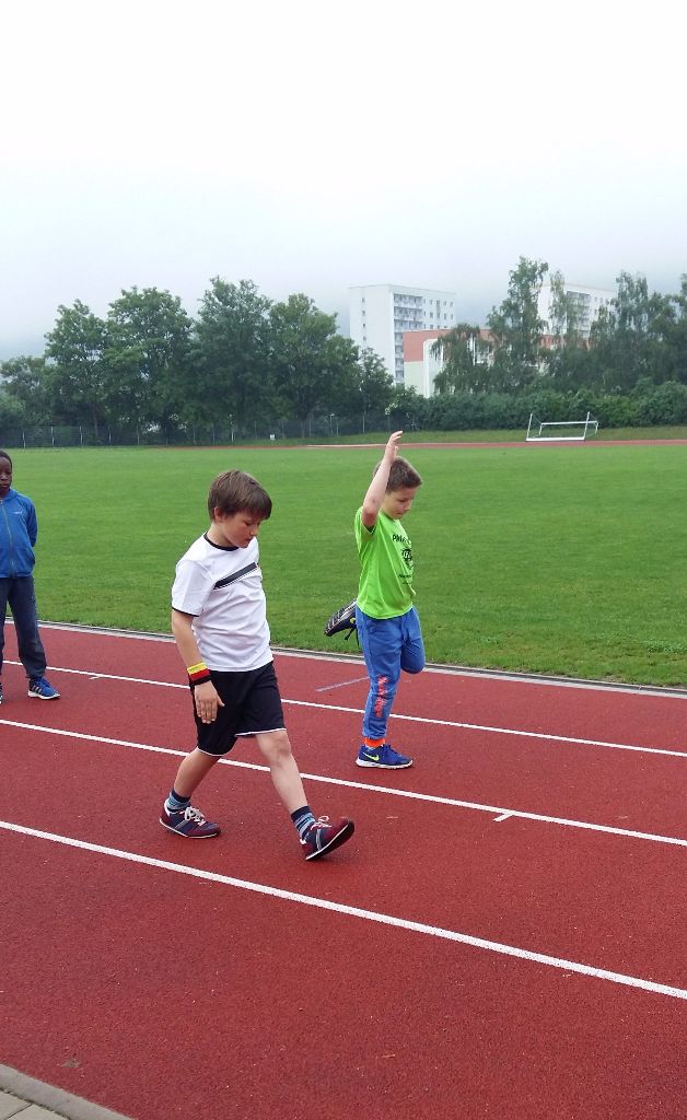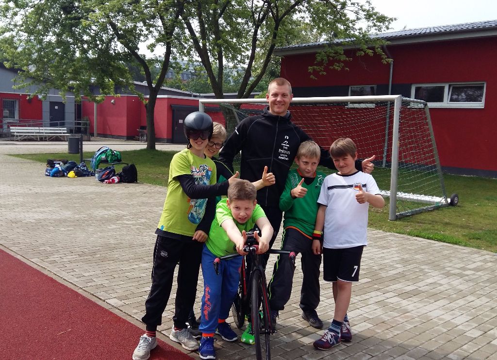 Der vierte und letzte Tag begann leider ziemlich verregnet. Aber davon ließen wir uns nicht abhalten und traten wie geplant den Weg zum Sportplatz Lobeda-West an. Dort angekommen wurde es dann so langsam auch wieder trocken von oben und wir konnten mit unserem Lauftraining beginnen. Zu jedem Training gehört eine ordentliche Erwärmung. So lockerten wir erst einmal unsere Gelenke, von den Schulten, über die Hüfte bis zu den Füßen. Danach liefen sich die Kinder eine runde locker auf der 400m Tartanbahn ein. Pünktlich um 9.00 Uhr traf auch unser special guest Aljoscha Willgosch ein, der mit uns gemeinsam den Vormittag verbrachte. Er kam dann auch gleich zum Einsatz und übernahm das Lauf-ABC mit den Schülern, welches sie koordinativ sehr beanspruchte. Danach waren dann alle ordentlich aufgewärmt und wir konnten weiter mit den Disziplinen für das Deutsche Sportabzeichen in den Bereichen Schnelligkeit, Kraft und Koordination machen. Los ging es mit 30 bzw. 50 m Sprint. Die vorgegebenen Zeiten schafften alle Schüler trotz rutschiger Laufbahn ohne Probleme. Mit Seilspringen sah es dann schon etwas schwieriger aus. Nicht alle konnten sich mit dem Seil anfreunden. Aber das war kein Problem, denn in die Kategorie Koordination, gehört auch noch Weitsprung, welches auch noch auf dem Programm stand. Doch weiter ging es dann erstmal mit Standweitsprung. Hier sah das ganze schon wieder besser aus, genauso wie beim Weitsprung, und einige der Schüler schafften recht gute Weiten. Die Zeit war mittlerweile schon recht schnell fortgeschritten und so stärkten wir uns mit einem kräftigen Frühstück. Währenddessen die Schüler die Disziplinen für das Sportabzeichen absolvieren traf auch das Fernsehteam von „Jena TV“ ein und filmte die Kinder beim Sport machen. Nach dem Frühstück hatten die Schüler dann Zeit Aljoscha Fragen in den Bauch zu bohren. Damit das Ganze nicht ganz so trocken von statten ging, hatte Aljoscha sein Zeitfahrrad mit, auf das sich jeder mal setzen konnte, sein Zeitfahrhelm, Lauf- und Radschuhe, seinen Triathloneinteiler sowie den Neoprenanzug. Die Jungs waren total beeindruckt von diesen Sachen und wollten alles anfassen und anprobieren. Auch waren sie sehr an Aljoscha und dem Triathlon interessiert. Am liebsten hätten sie ihn noch den ganzen Tag mit Fragen überhäuft. Doch wir mussten ja schließlich auch noch sportlich etwas machen. Nach einem gemeinsamen Gruppenfoto verabschiedete sich Aljoscha wieder und wir gingen weiter im Programm. Auf dem Plan standen noch Start- und Reaktionsübungen. Dabei bildeten wir 2 Teams. Team 1 stellte sich an der Grundlinie auf, Team 2 ungefähr 4m vor sie. Durch verschiedene Ausgangspositionen, wie Hocke, Liegestütz, Bauch- und Rückenlage, musste auf Startsignal losgelaufen werden. Team 1 musste dabei versuchen Team 2 ein zu fangen. Danach wurde gewechselt. Den Schluss bildete dann ein Staffellauf, in dem jeder eine viertel Rund der 400m Bahn laufen musste. Hier zeigten nochmal alle ihren Kampfgeist und was sie im Laufen alles draufhaben. Bevor es zurück zur Schule ging setzten wir uns in eine kleine Auswertungsrunde zusammen. Jeder gab sein persönliches Feedback über die Woche ab. Letztendlich hat es allen 7 Schülern sehr viel Spaß gemacht. Die einen fanden das Schwimmen, die anderen das Radfahren und wiederum andere fanden alles total klasse. Aber am besten fanden alle den Besuch von Aljoscha, da gingen alle Daumen nach oben. Von meiner Seite aus kann ich mich den Schülern nur anschließen. Auch mir hat es viel Spaß gemacht eine ganze Woche mit den Schülern zu verbringen und ihnen den Triathlon etwas näher zu bringen. Beide Seiten haben für sich viele neue Erfahrungen gesammelt und vielleicht sehen wir ja den einen oder anderen beim Triathlon in Jena wieder.