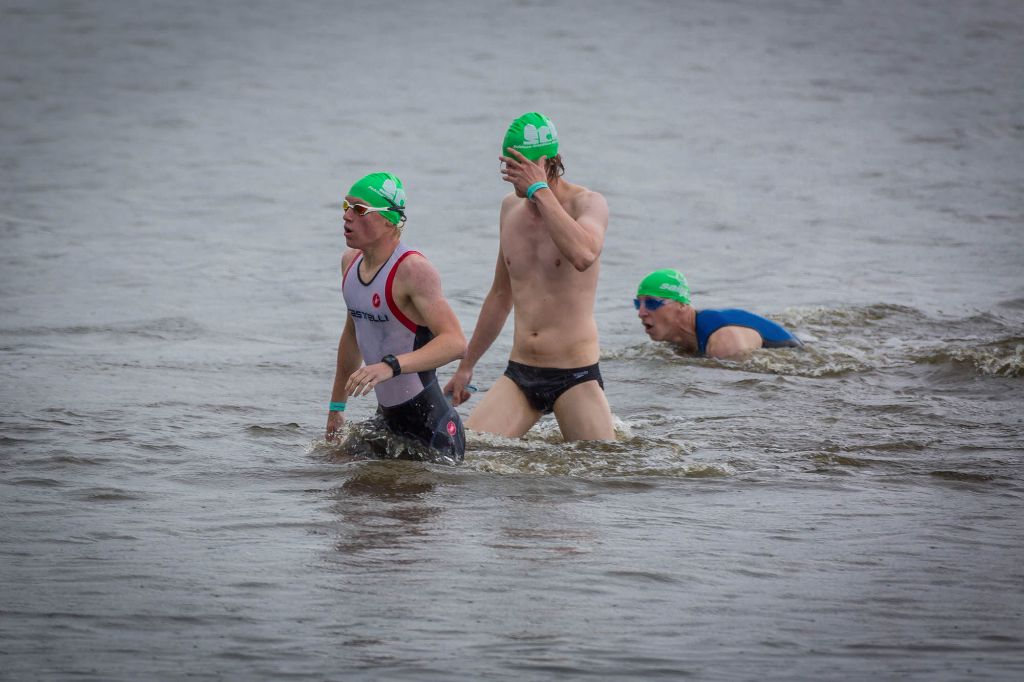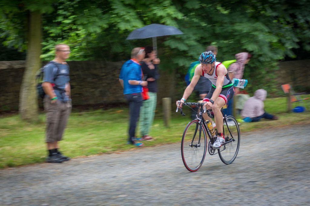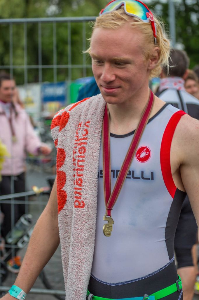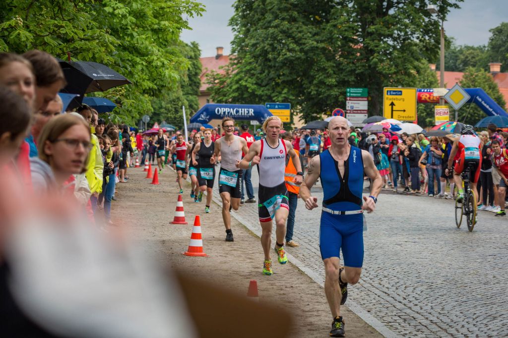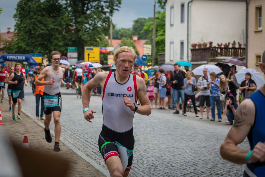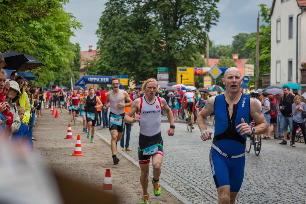 Im 22,5 Grad warmen Schlossteich ging es jetzt aber erst mal zum Schwimmen – ohne Neo. Tilman startete in der ersten Welle und konnte sich mit 12:20min auf 750m – der drittschnellsten Schwimmzeit – bereits im vorderen Feld platzieren. Nach einem schnellen Wechsel ging es aufs Rad und hiermit recht vorsichtig auf die vom Regen doch ziemlich rutschige Kopfsteinpflaster-Radstrecke, die zum Glück nach dem ersten Kilometer in zwar immer noch nassen, aber doch griffigeren Asphalt überging. Und hier konnte Tilman sich gegenüber seinen Konkurrenten durchsetzen und schaffte mit 36:01min die schnellste Radzeit seiner Altersklasse, den zweitschnellsten Radler noch dicht auf den Fersen.